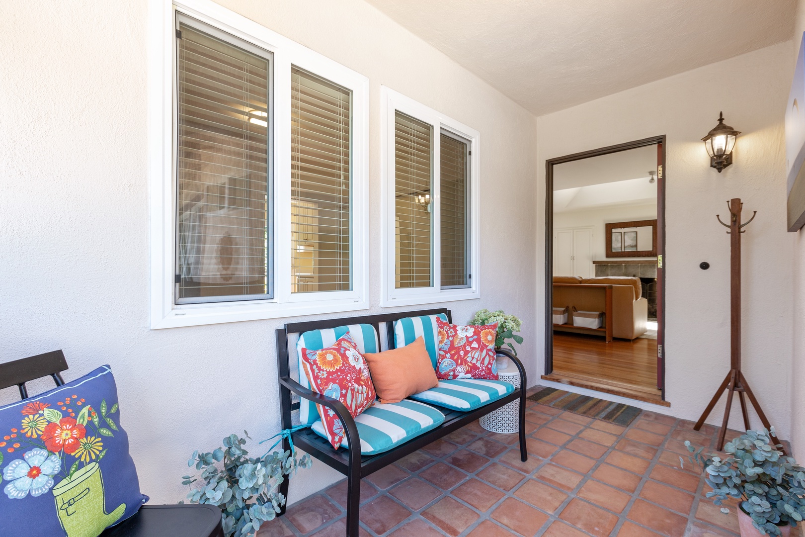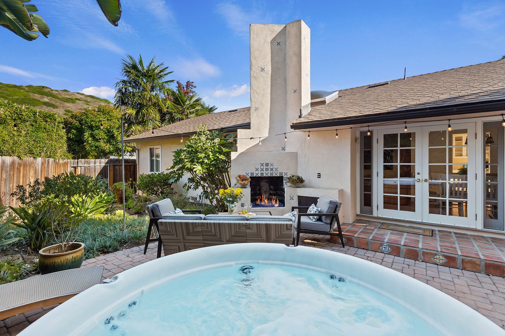 But the real magic? The beautiful backyard! This private outdoor haven is framed by lush tropical landscaping and features a hot tub, a cozy gas fireplace with colorful Spanish tile, and stylish lounge seating, ideal for enjoying warm Santa Barbara evenings. Dine alfresco, toast under the stars, or soak after a day of surf and sun—it's your personal slice of paradise.