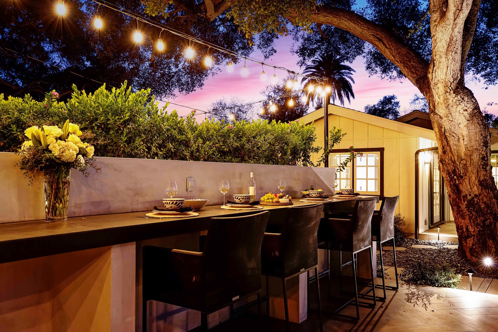 At the center of the house, the open-concept living area is designed for gathering. The gourmet kitchen is well-appointed with a Sub-Zero fridge, Wolf range, and quartz countertops. An expansive dining table sits under soft, ambient lighting, making every meal feel like an occasion. The adjacent wet bar, complete with an ice machine, adds a touch of refinement. Large French doors and accordion doors lead out to the backyard and flood the space with natural light, framing views of the lush backyard and creating an effortless indoor/outdoor space for guests to enjoy.