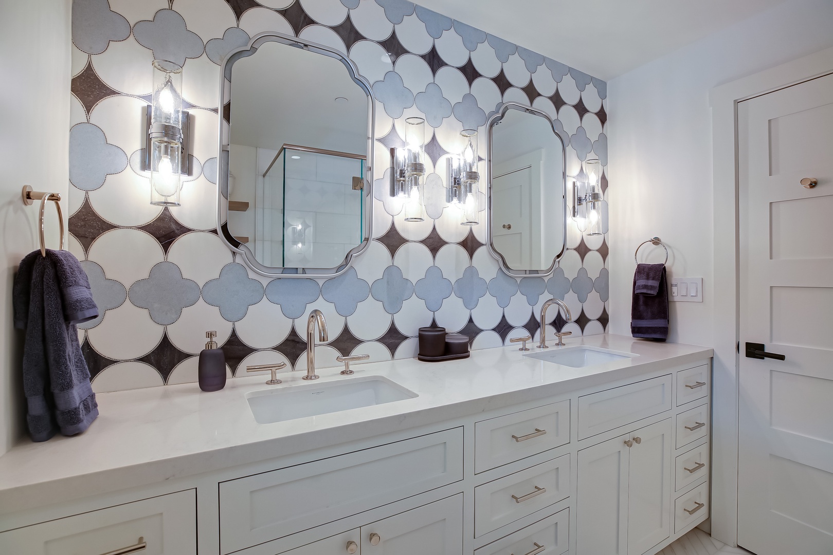 Another bright, airy, and well-appointed north bedroom also features a king bed, while the nearby guest room is furnished with two full beds. A well-placed guest bathroom with unique and stunning finishes serves this part of the home, ensuring convenience and luxury for all.