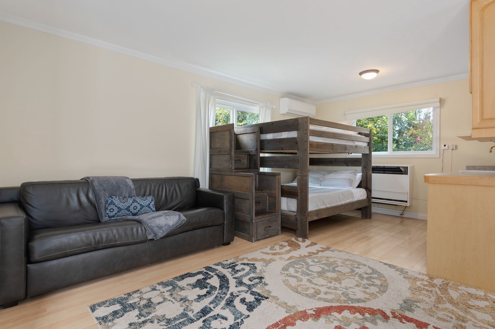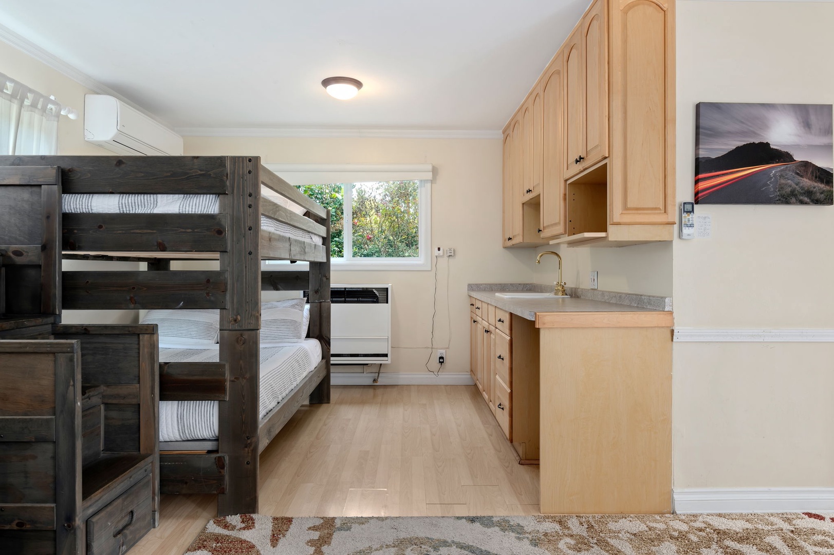 • On the entry level, you’ll find a king bedroom, full bath, cozy living room with Roku TV, a wet bar, and a fun bunk bed nook—great for kids or extra guests. A private lower patio offers a shady spot to unwind next to a seasonal creek.