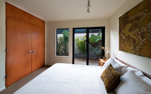 Designed as dual master suites, both bedrooms feature king-size beds, curated Asian-inspired décor, and beautifully finished en-suite bathrooms—creating a hotel-caliber experience within the comfort of a private home. Natural light filters through signature stained glass details, highlighting the home's artistic flair and modern sensibility.