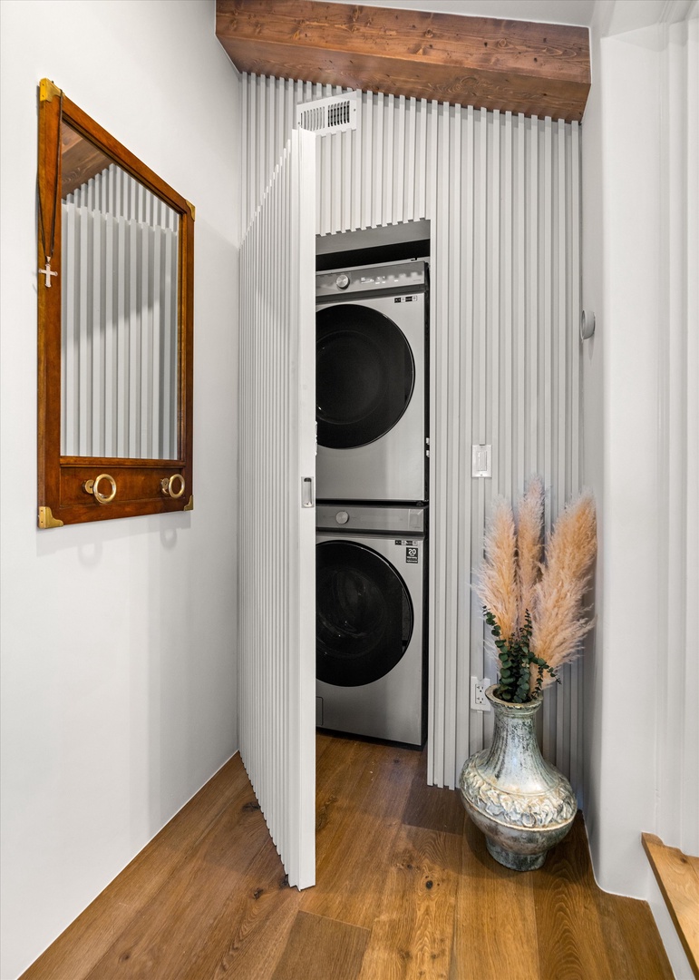 The Treehouse also features two well appointed bedrooms, one with a king-sized bed, and one with a queen-sized bed, and en-suite bathrooms. The primary bedroom of the Treehouse has a deck with gorgeous views, and a fire-pit for cooler coastal evenings. There is also a laundry closet with a washer/dryer in the guest room of this unit.