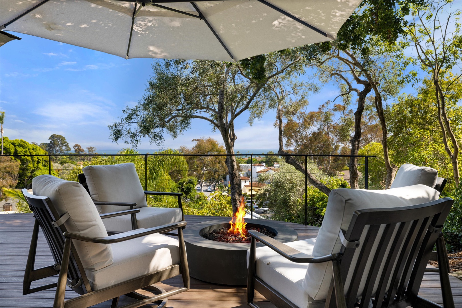 This upper unit duplex has a cozy living room with a fireplace. As you step outside the kitchen door and on to the deck, you will find a beautiful outdoor kitchen; complete with state of the art appliances that will make any BBQ, a special one! From the deck off the kitchen, you will walk up a flight of stairs that will lead you to a gorgeous entertainment deck with stunning ocean views, a fire-pit and large expandable umbrellas; so that you can enjoy both the sun filled days or star filled evenings from this serene space.