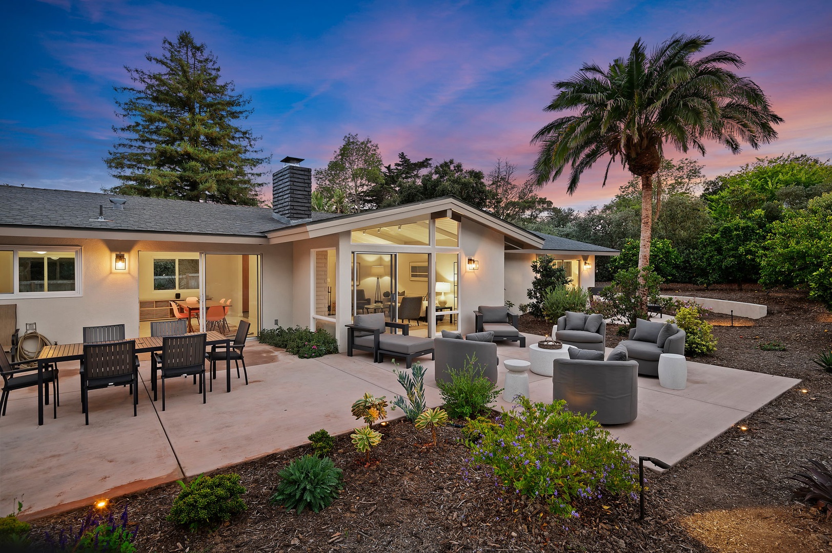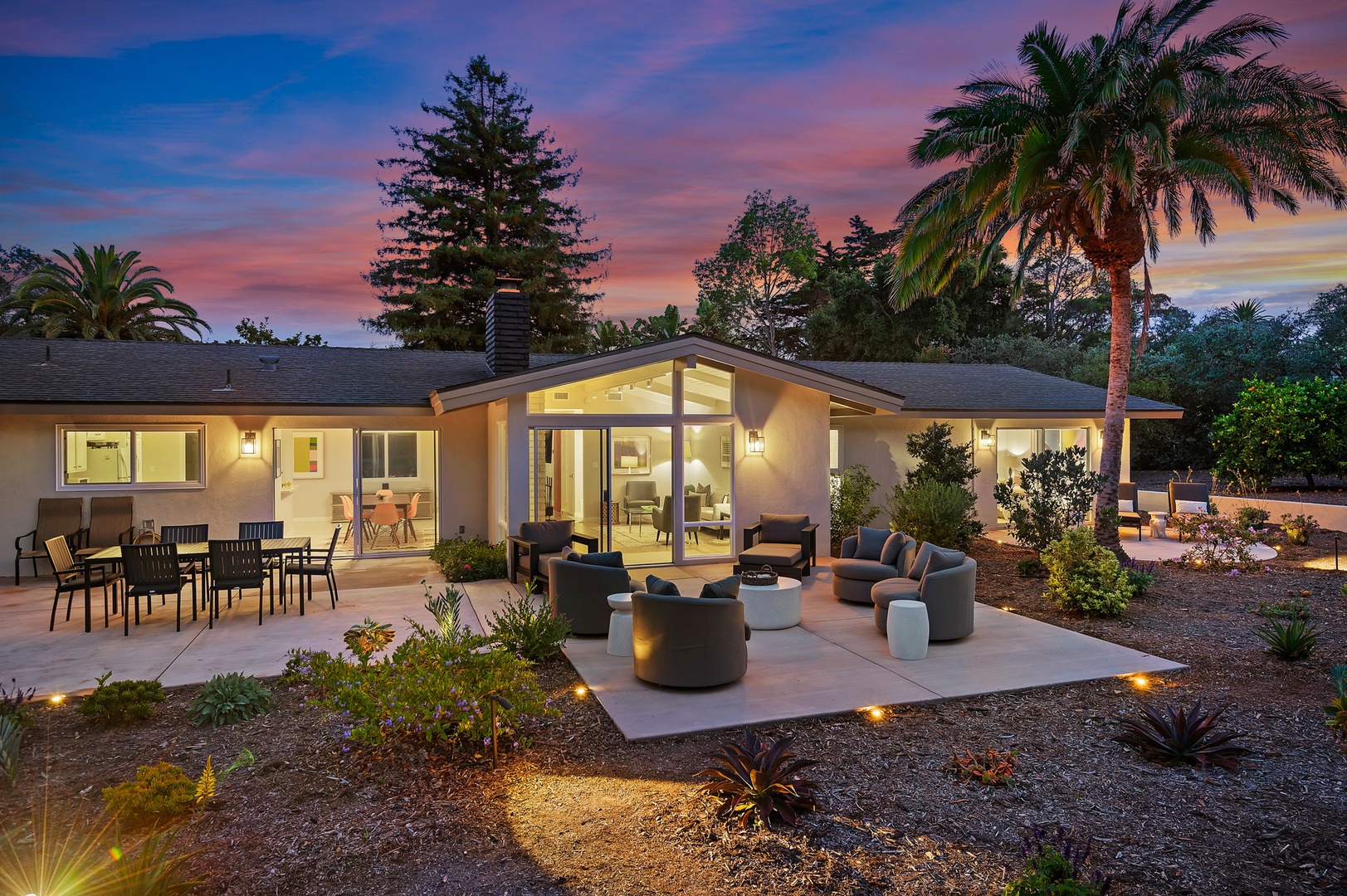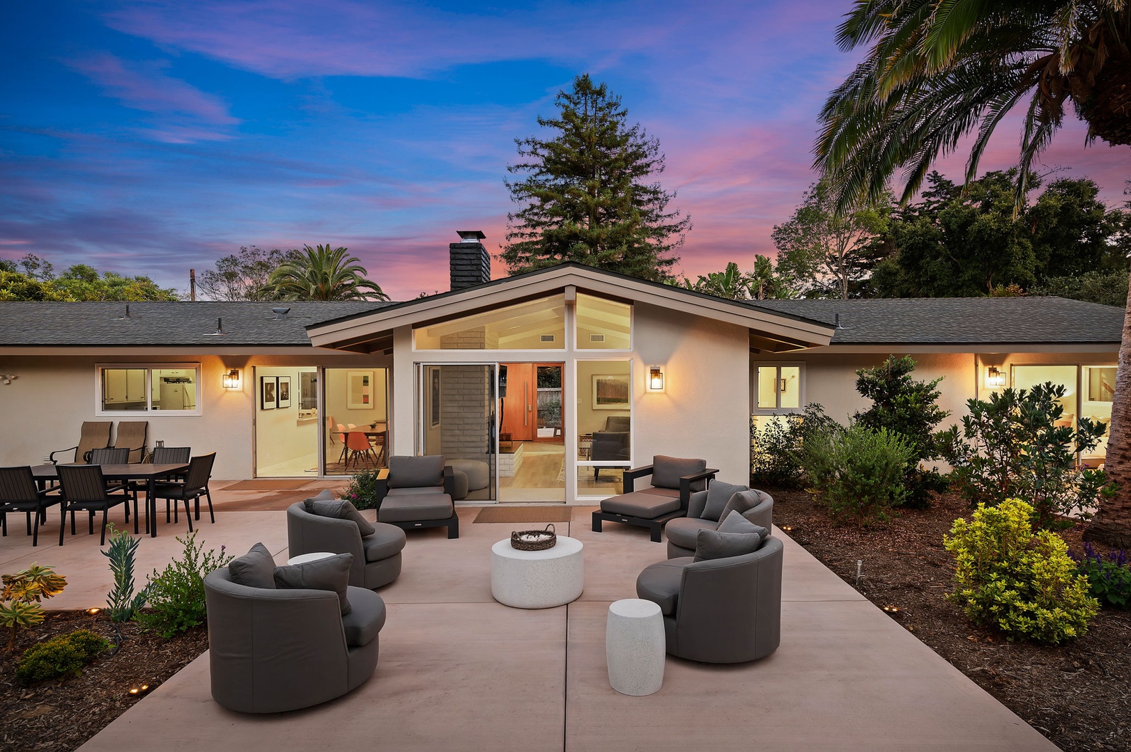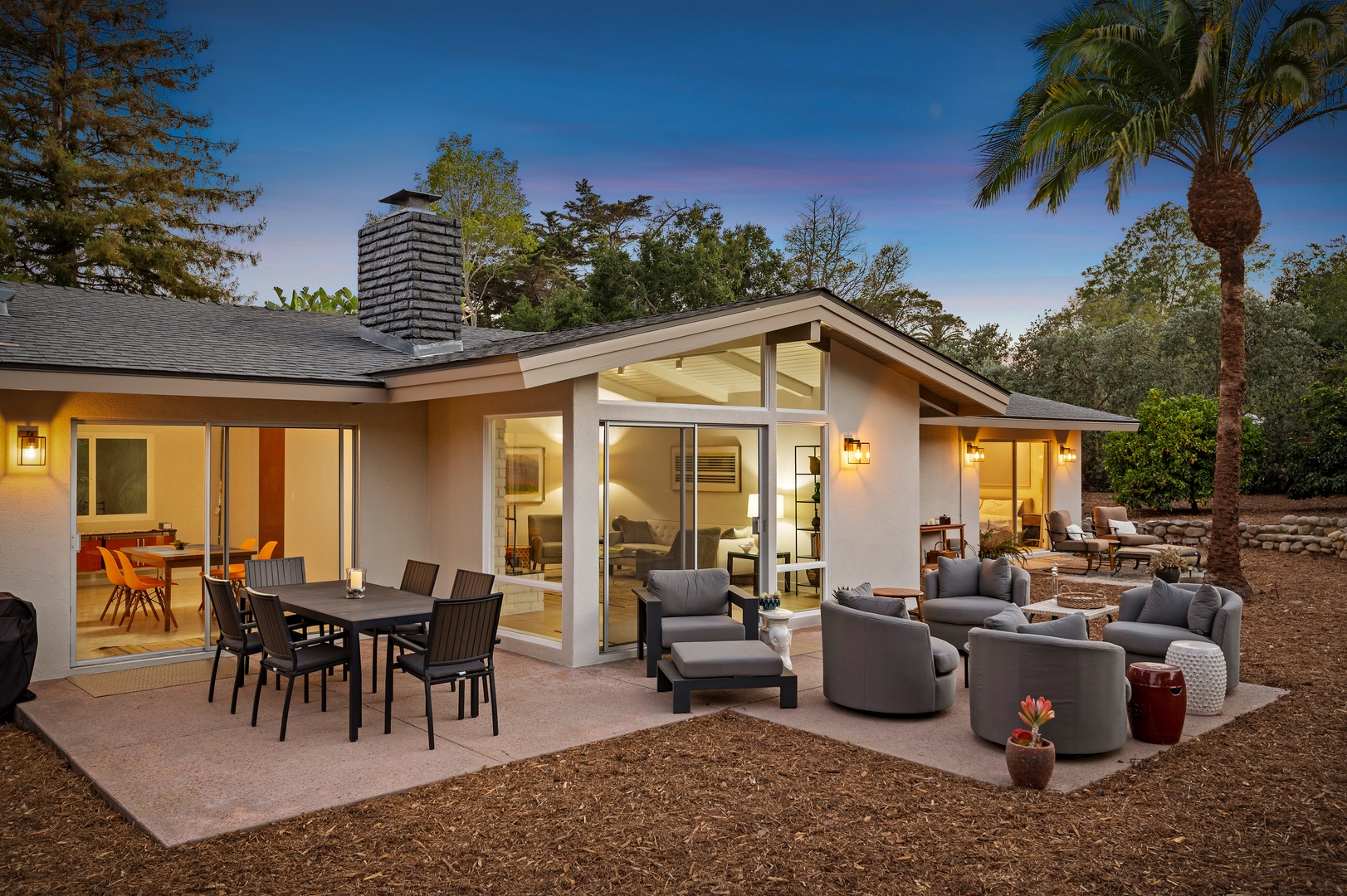This mid-century modern gem effortlessly blends iconic design with contemporary comfort. Inside, you'll find three beautifully appointed bedrooms designed to accommodate up to six guests. The primary suite features a king-size bed, en-suite bathroom, and private access to a sprawling, orchard-lined backyard—your own secluded sanctuary beneath the foothills. The two guest rooms, one with a queen bed and the other with two twins, share a thoughtfully designed bath with a tub/shower combination.