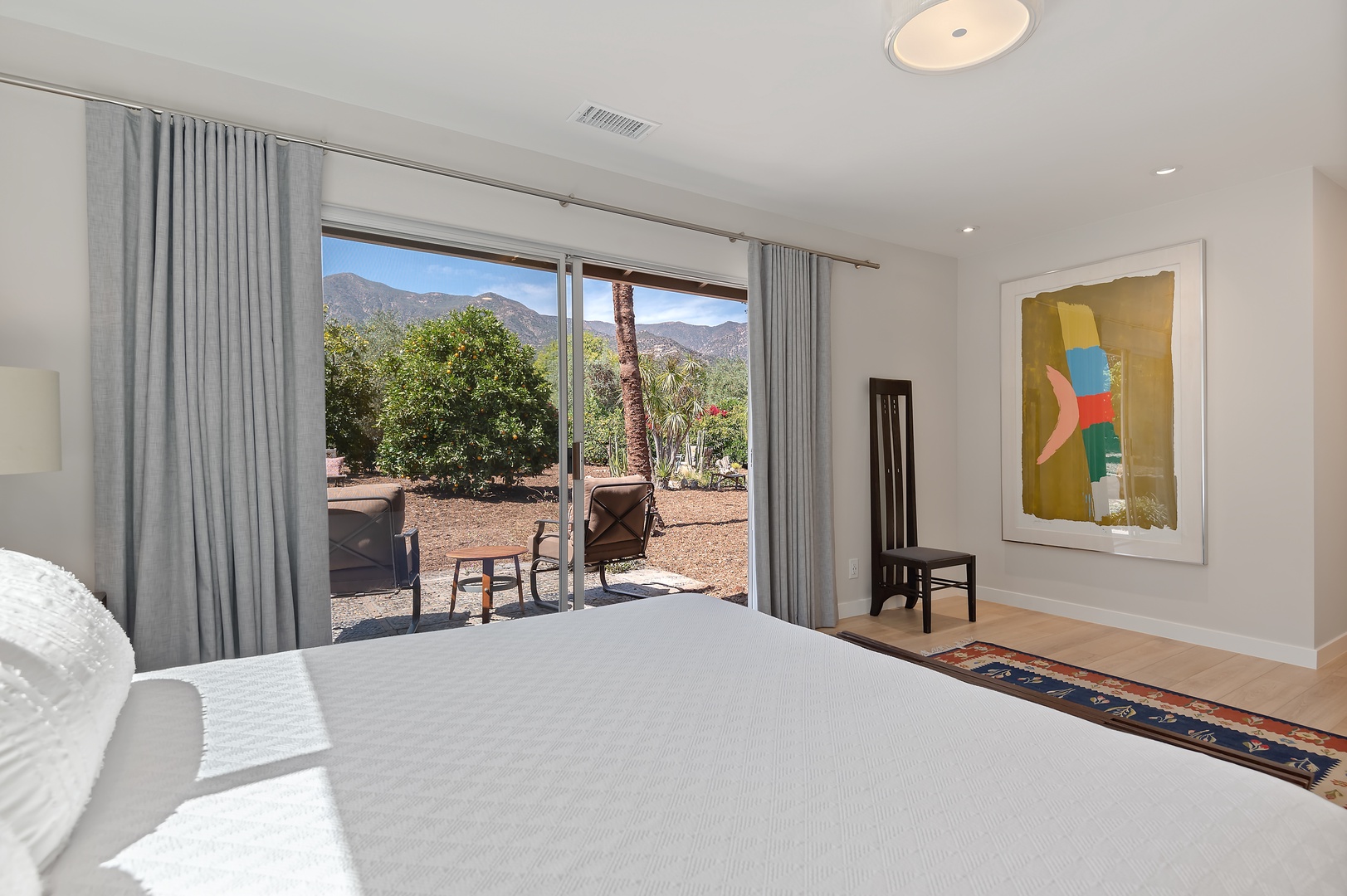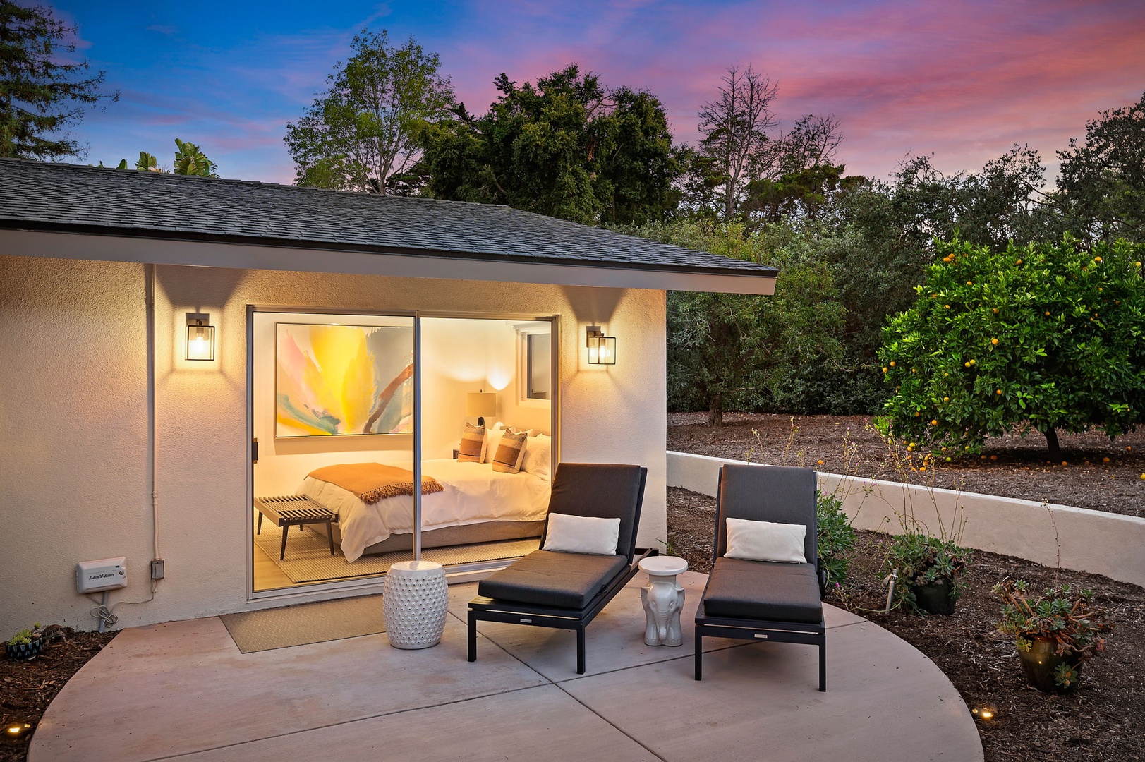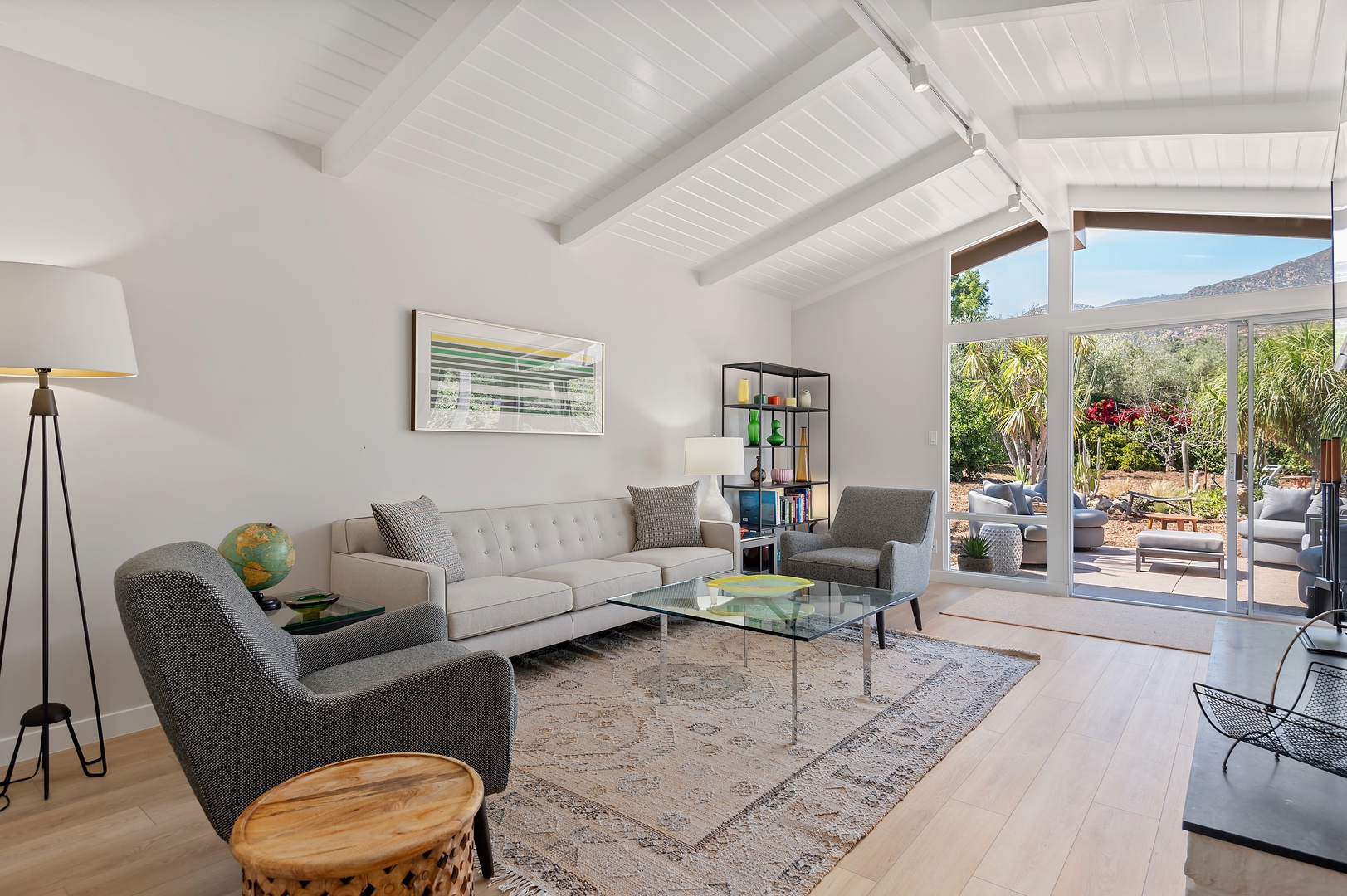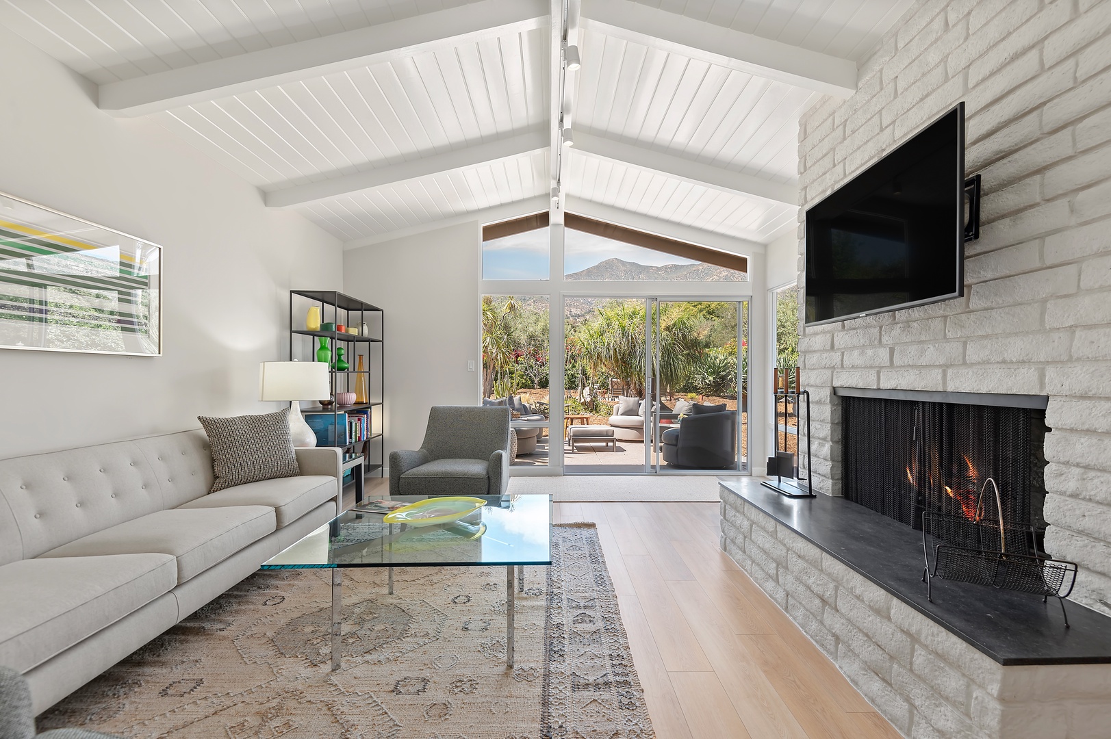 This mid-century modern gem effortlessly blends iconic design with contemporary comfort. Inside, you'll find three beautifully appointed bedrooms designed to accommodate up to six guests. The primary suite features a king-size bed, en-suite bathroom, and private access to a sprawling, orchard-lined backyard—your own secluded sanctuary beneath the foothills. The two guest rooms, one with a queen bed and the other with two twins, share a thoughtfully designed bath with a tub/shower combination.