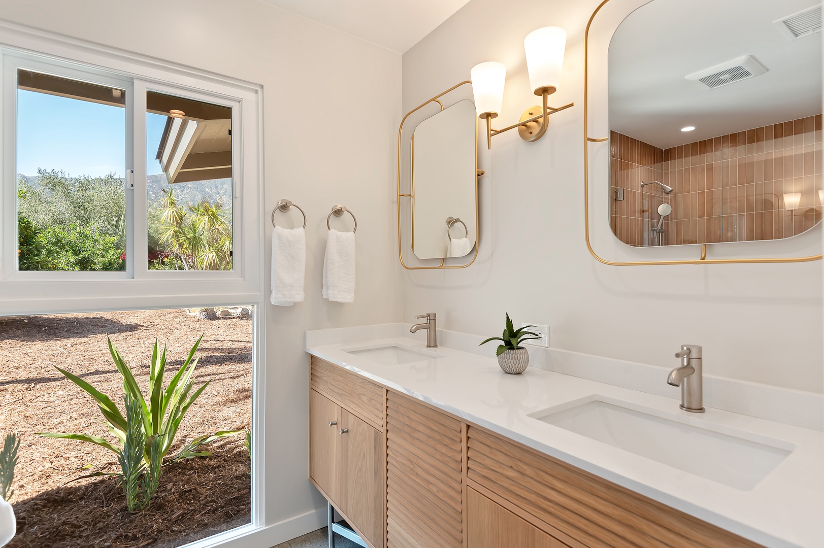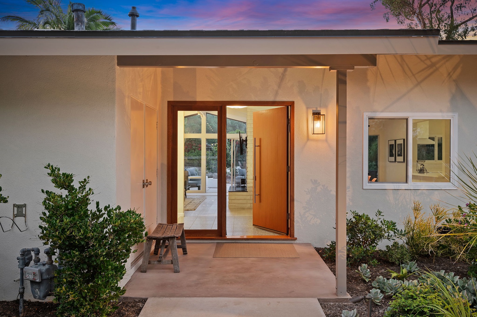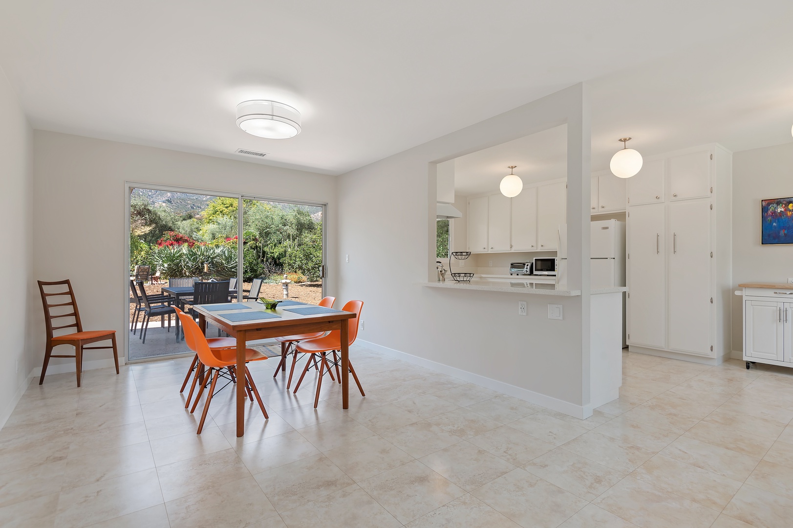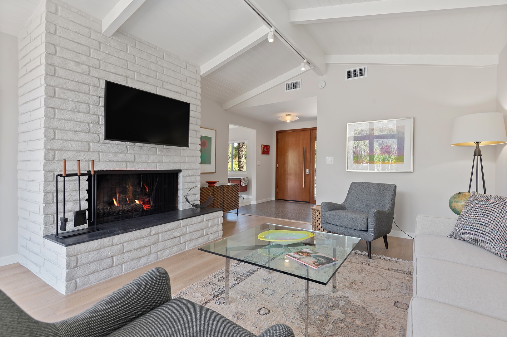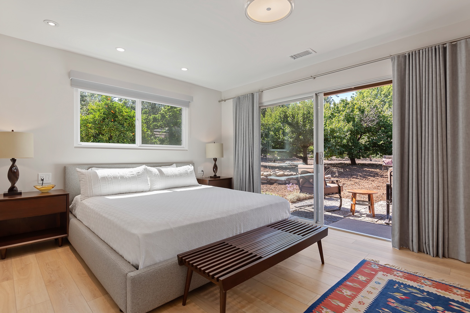 This mid-century modern gem effortlessly blends iconic design with contemporary comfort. Inside, you'll find three beautifully appointed bedrooms designed to accommodate up to six guests. The primary suite features a king-size bed, en-suite bathroom, and private access to a sprawling, orchard-lined backyard—your own secluded sanctuary beneath the foothills. The two guest rooms, one with a queen bed and the other with two twins, share a thoughtfully designed bath with a tub/shower combination.
