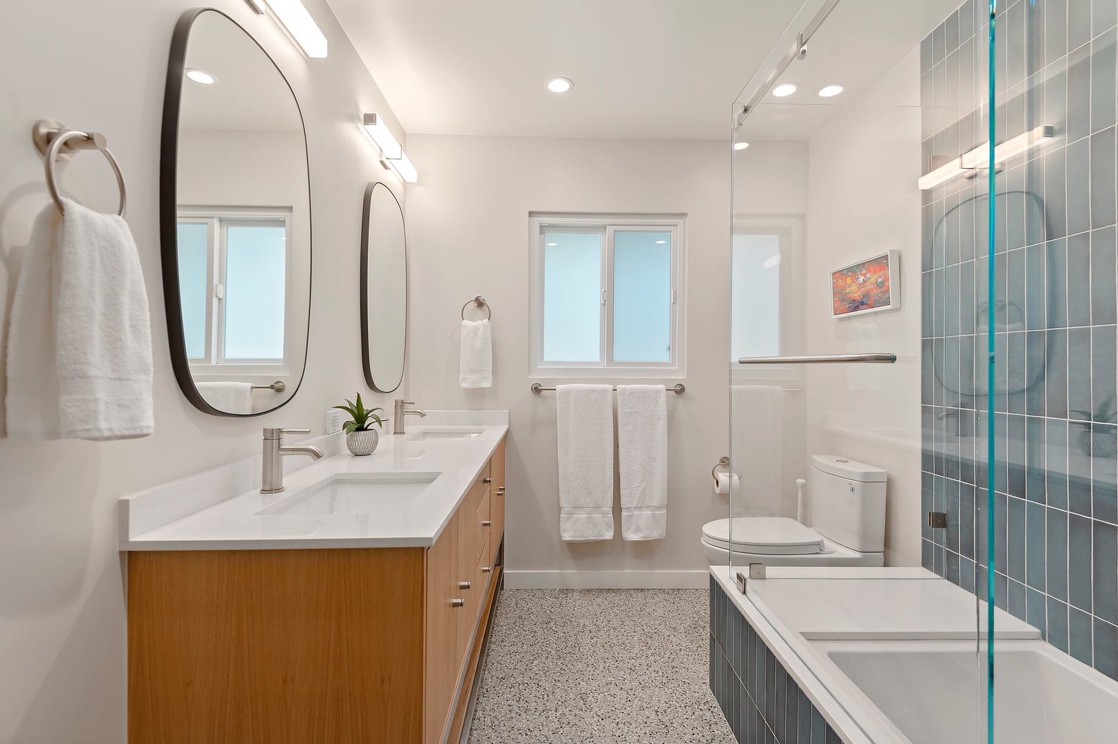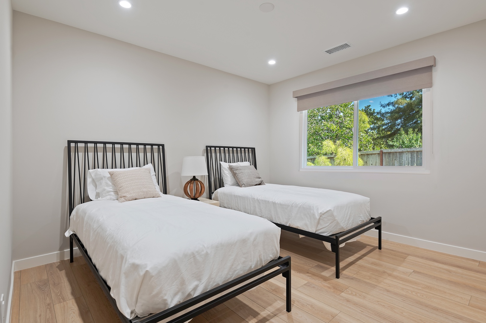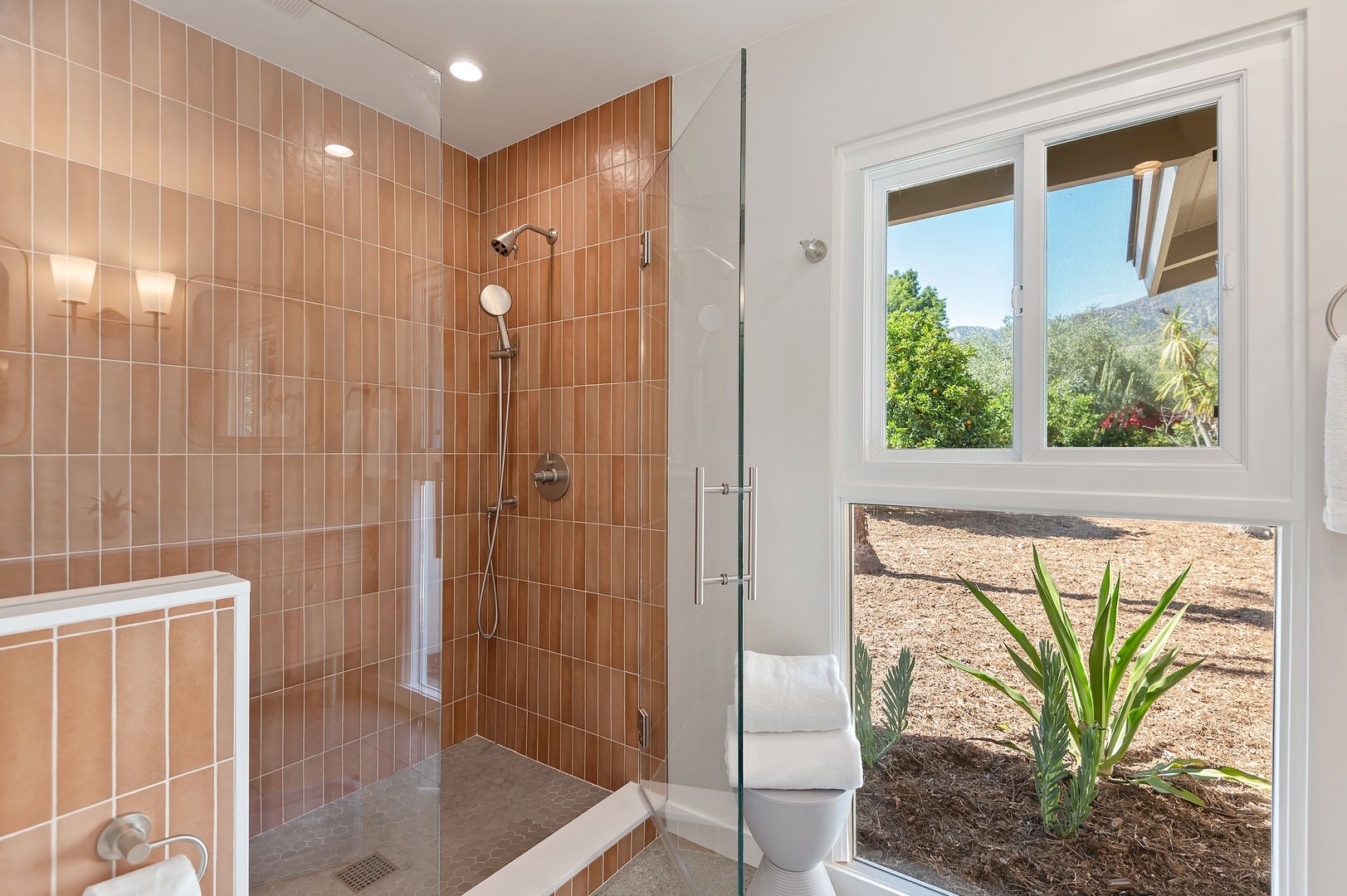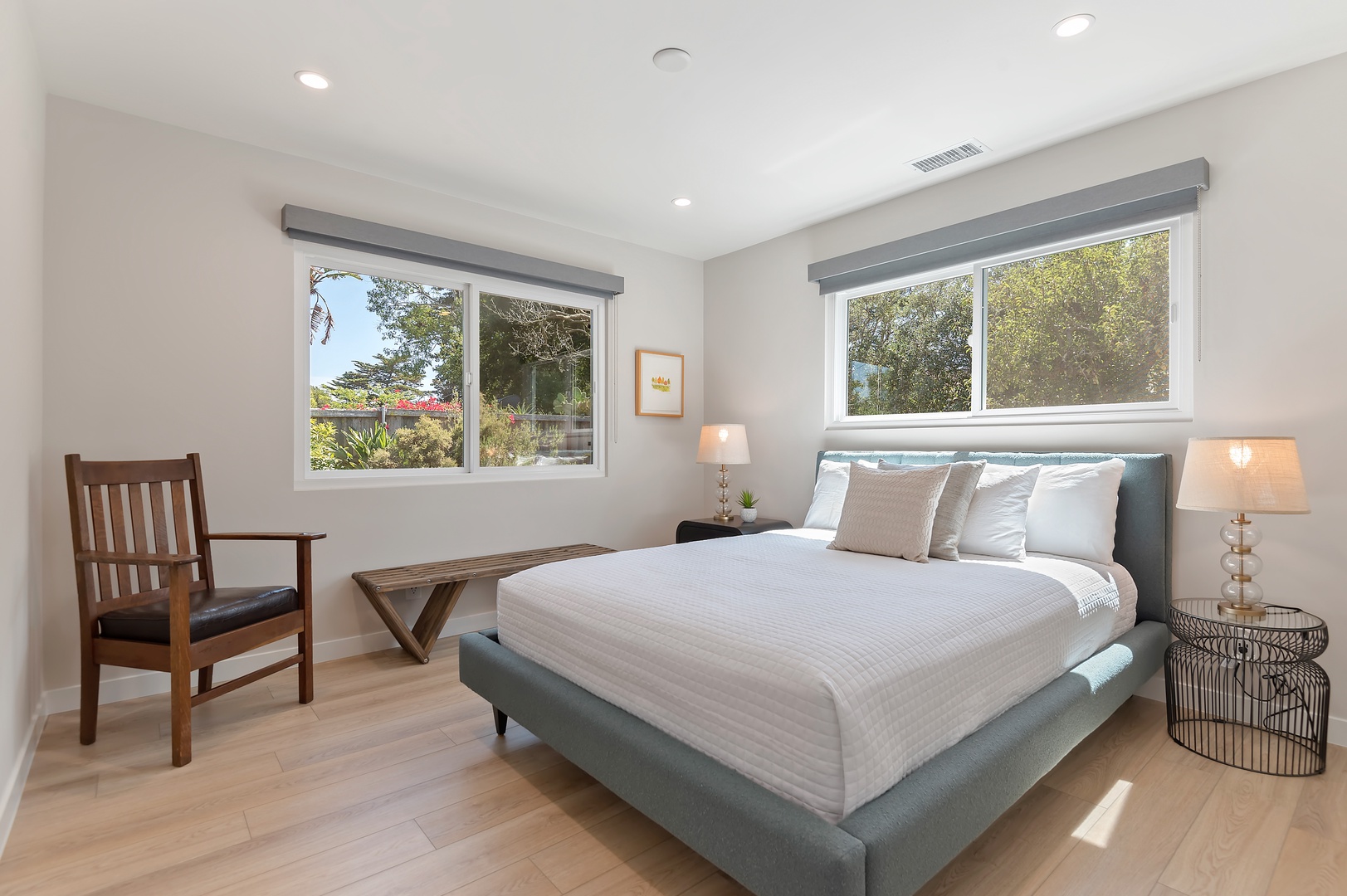 This mid-century modern gem effortlessly blends iconic design with contemporary comfort. Inside, you'll find three beautifully appointed bedrooms designed to accommodate up to six guests. The primary suite features a king-size bed, en-suite bathroom, and private access to a sprawling, orchard-lined backyard—your own secluded sanctuary beneath the foothills. The two guest rooms, one with a queen bed and the other with two twins, share a thoughtfully designed bath with a tub/shower combination.