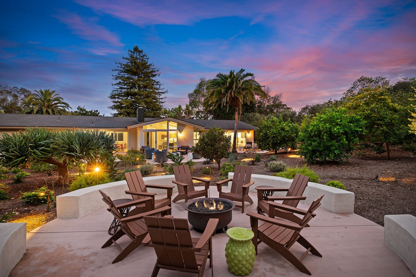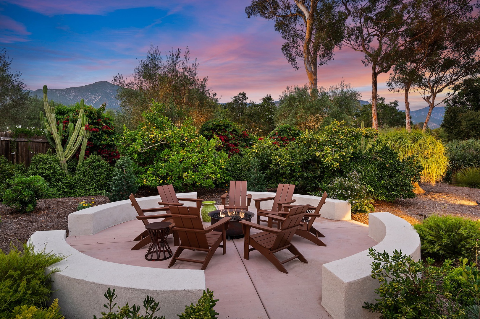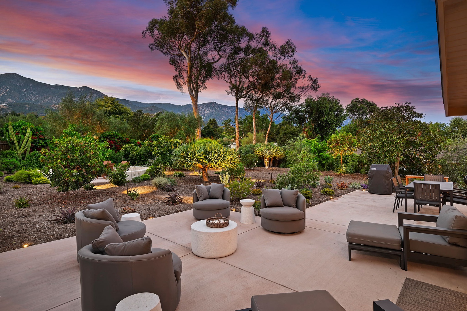Step outside into a peaceful, private haven with uninterrupted views of the Santa Barbara Foothills. Multiple outdoor living spaces offer options for al fresco dining, sun-drenched relaxation, or cozying up by the fire pit with a glass of Central Coast wine as the stars appear overhead.