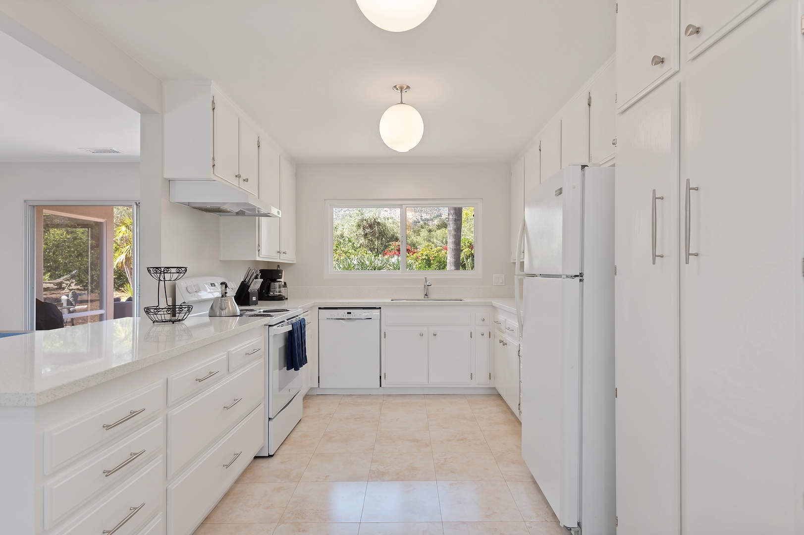 The living room invites quiet evenings and stylish gatherings, with a large-screen television and statement fireplace as the focal points. The kitchen, with its retro-chic aesthetic and modern amenities, is both functional and fabulous—perfect for everything from morning coffee to elegant in-home dining.